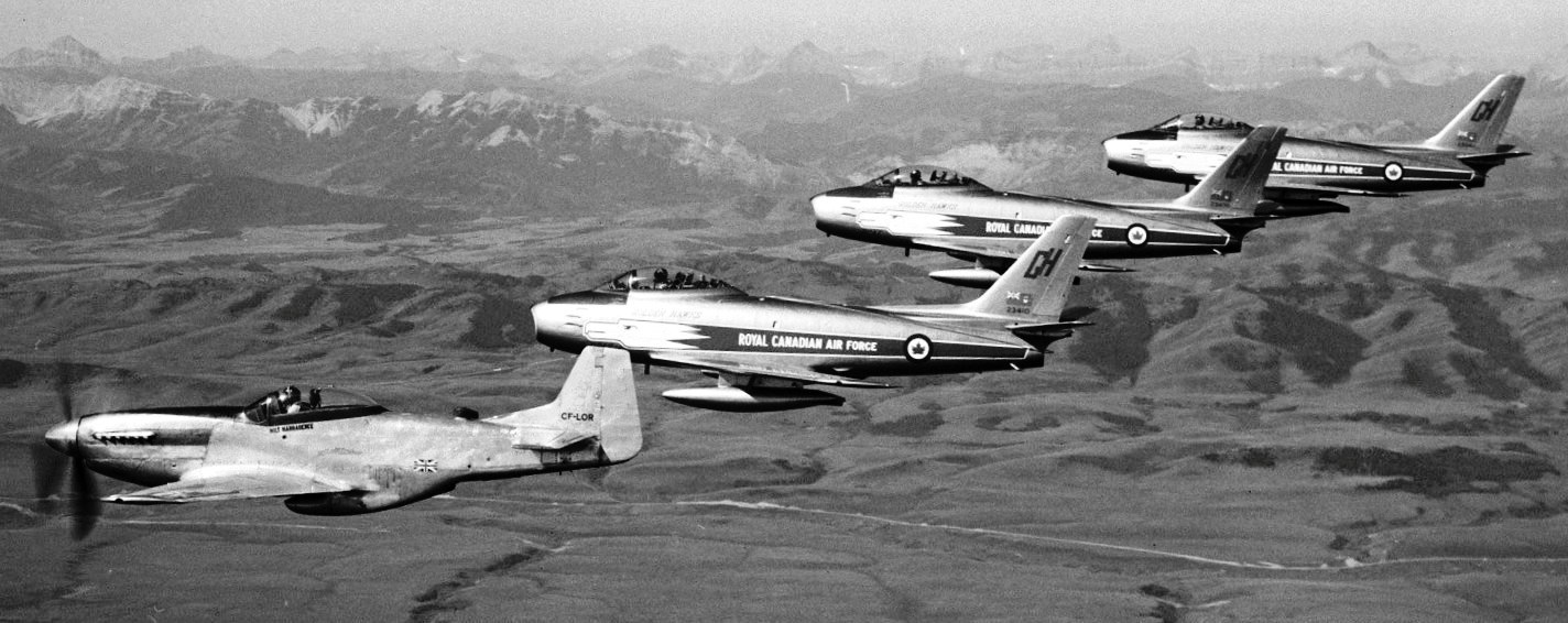Canadair F-86 Sabre Mk. 6, Golden Hawks in formation with a North American P-51D Mustang, Reg. No. CF-LOR.