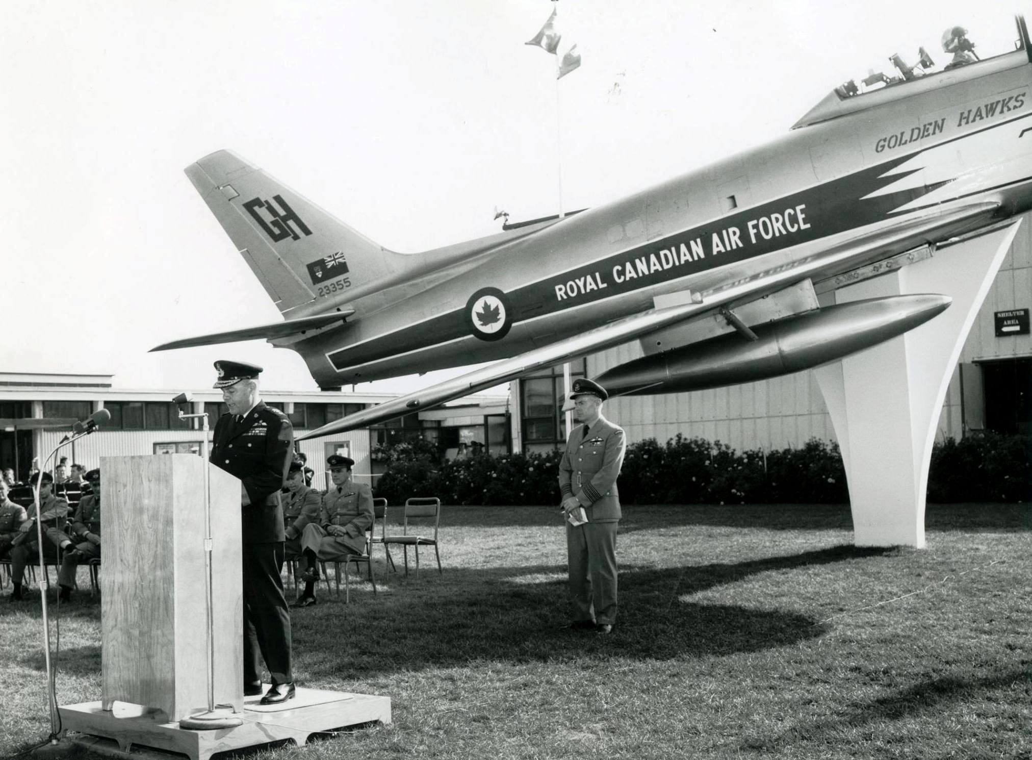 On 23 Sep 1967, RCAF Station Chatham held a Golden Hawks Appreciation Day as part of their Centennial celebrations, to commemorate the famous aerobatic team that put Chatham on the map.  It was during this ceremony that the Golden Hawk aircraft and the memorial plaque were unveiled in front of the Rec Centre.