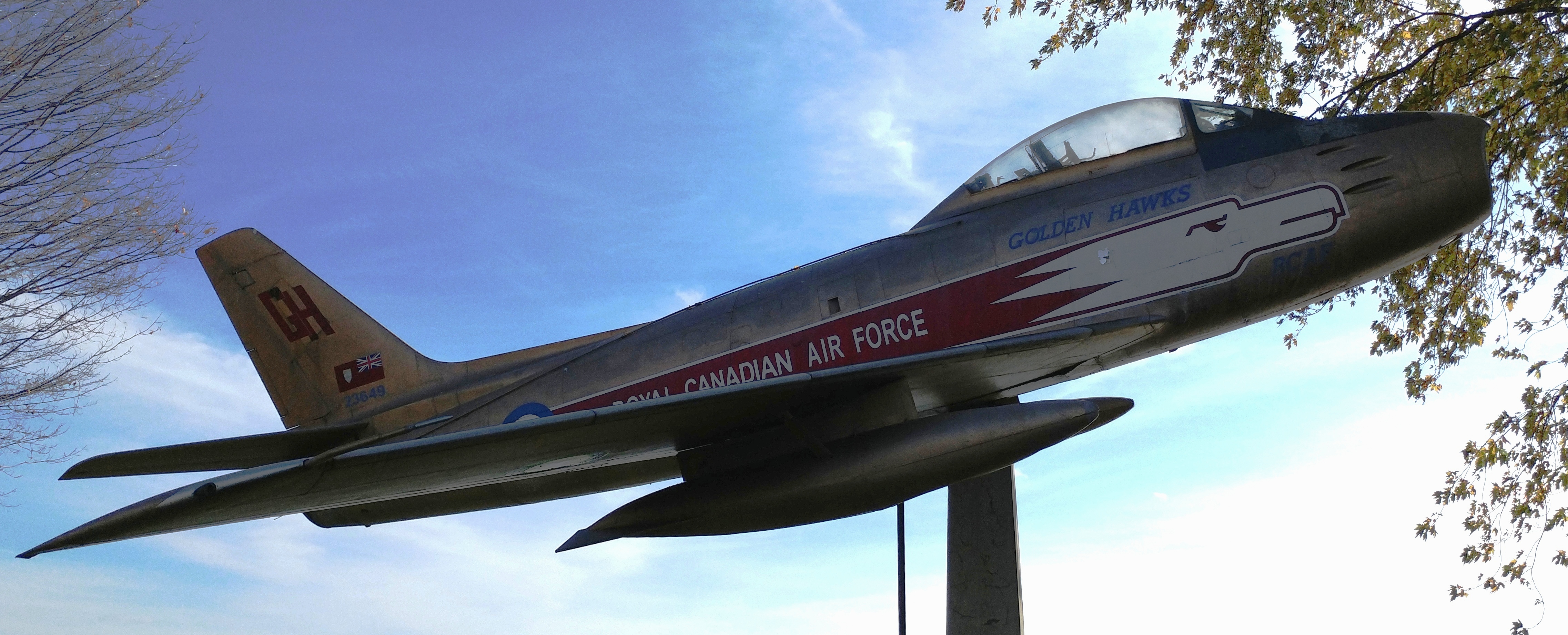 Canadair F-86 Sabre Mk. 6 (Serial No. 23649), Golden Hawks, mounted on a pylon in a park in the City of Brockville, Ontario.