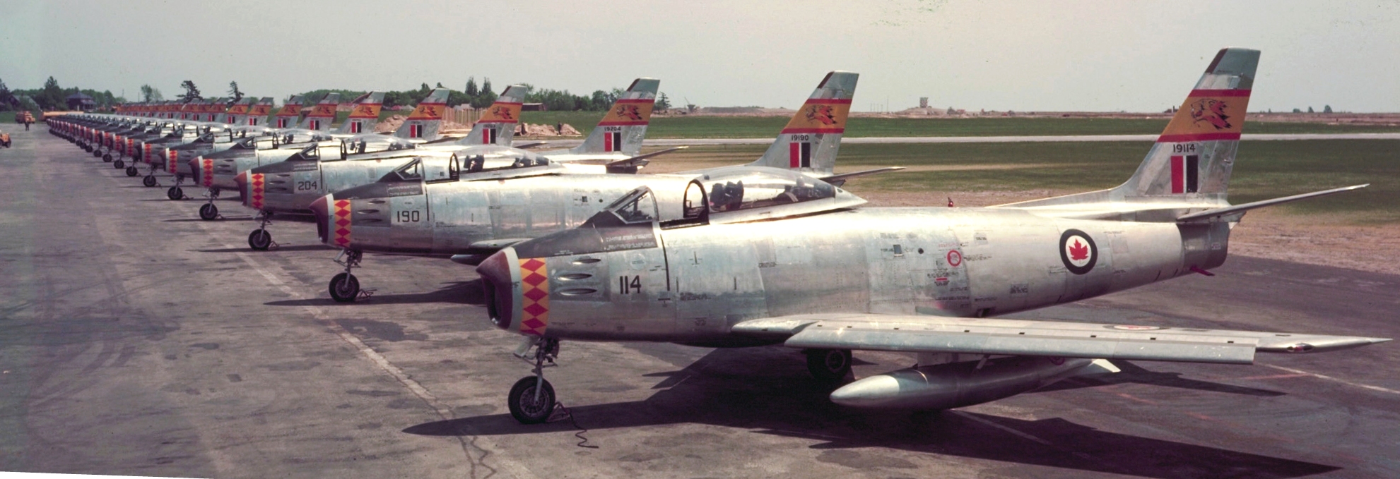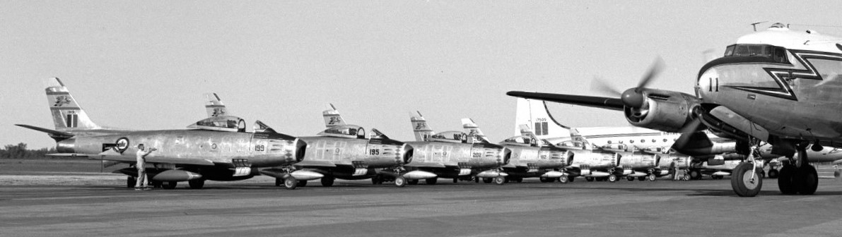 Canadair F-86 Sabres, No. 439 Squadron, lined up on the tarmac at RCAF Station Uplands, Ottawa, Ontario.