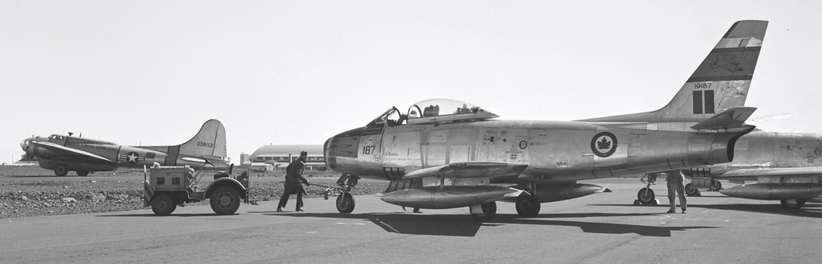 CanadairF-86 Sabre Mk. 2 (Serial No. 19187), No. 439 Squadron, with a USAF Boeing B-17 Flying Fortress in the background, ca 1952.