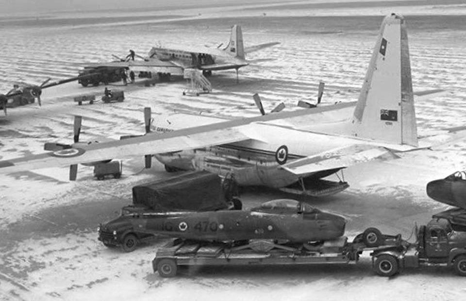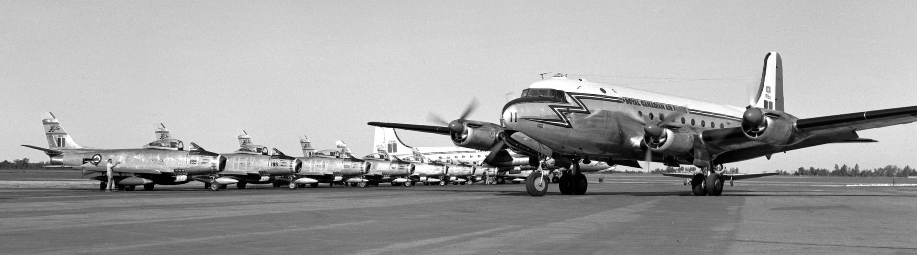 Canadair F-86 Sabres, No. 439 Squadron, with a Canadair CL-2 North Star at RCAF Station Bagotville, Quebec, on the first stop on a crossing to England.