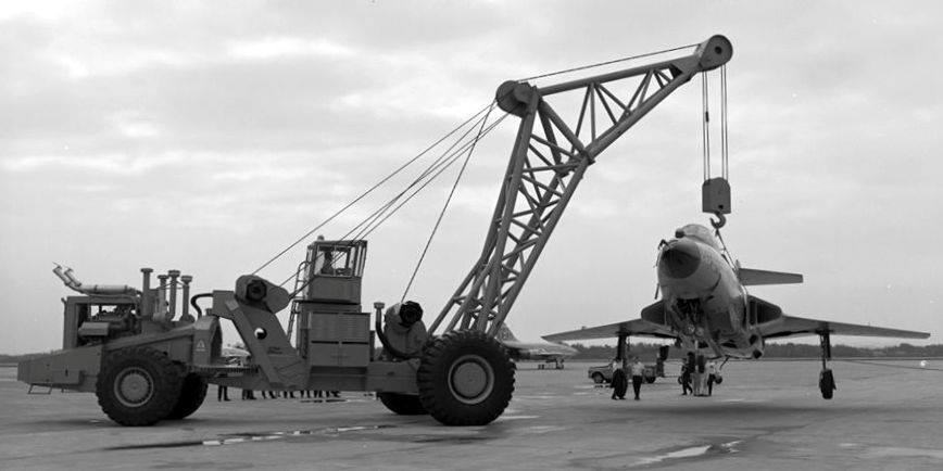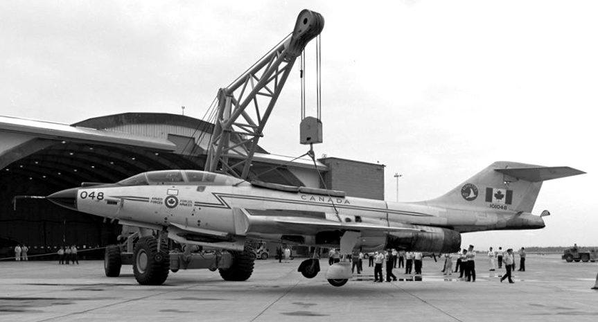 McDonnell CF-101 Voodoo (Serial No. 101048), No. 425 Squadron, being lifted by a giant crane after it turned off the runway too fast and its nose wheel collapsed. Hangar 6 in the background. The crane was nicknamed “Dino” after the Flintstones cartoon show.