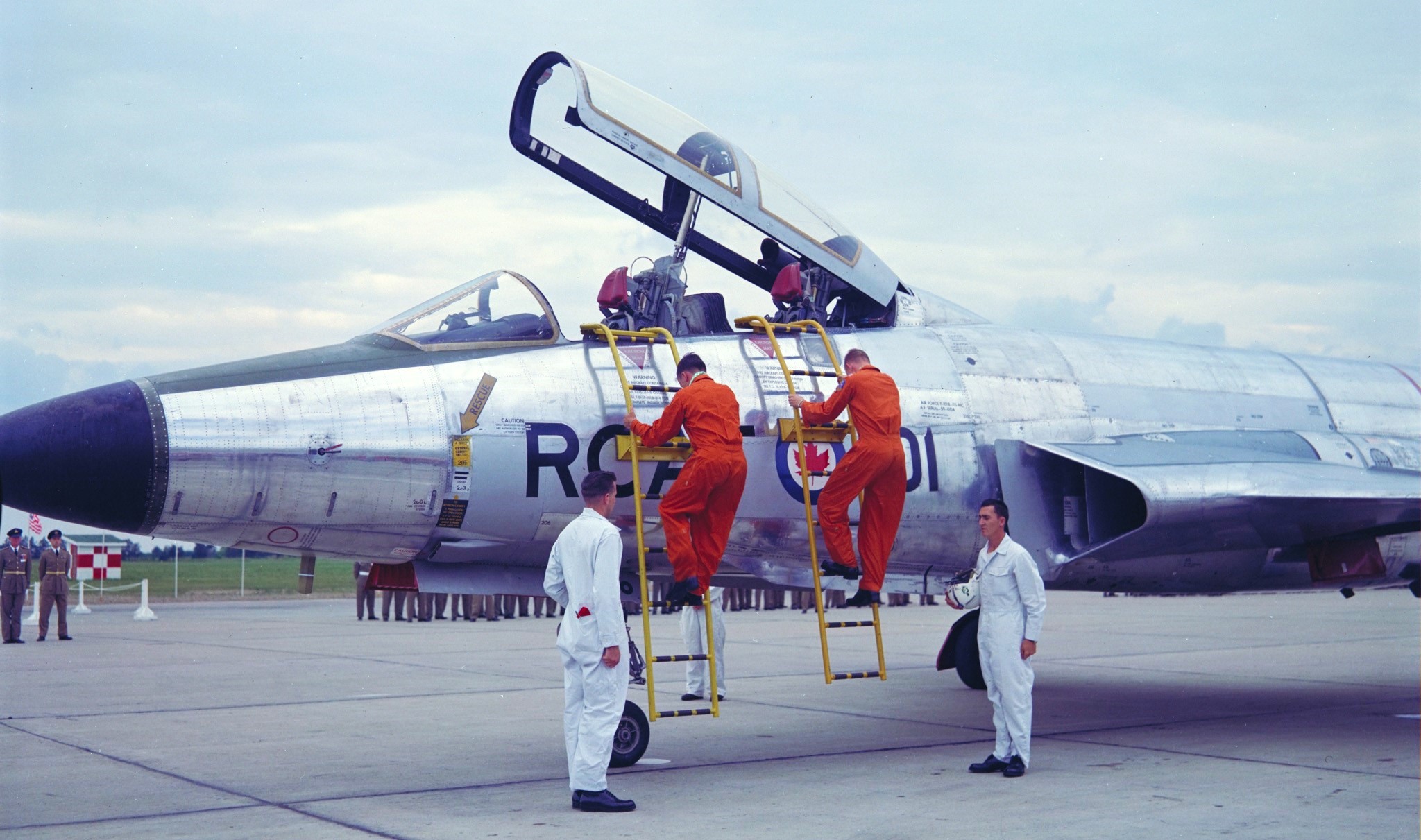 McDonnell CF-101B Voodoo (Serial No. 17101), with two USAF aircrew descending after taxiing up to the official hand-over ceremony of the first CF-101B at RCAF Station Uplands, Ontario in July, 1961.