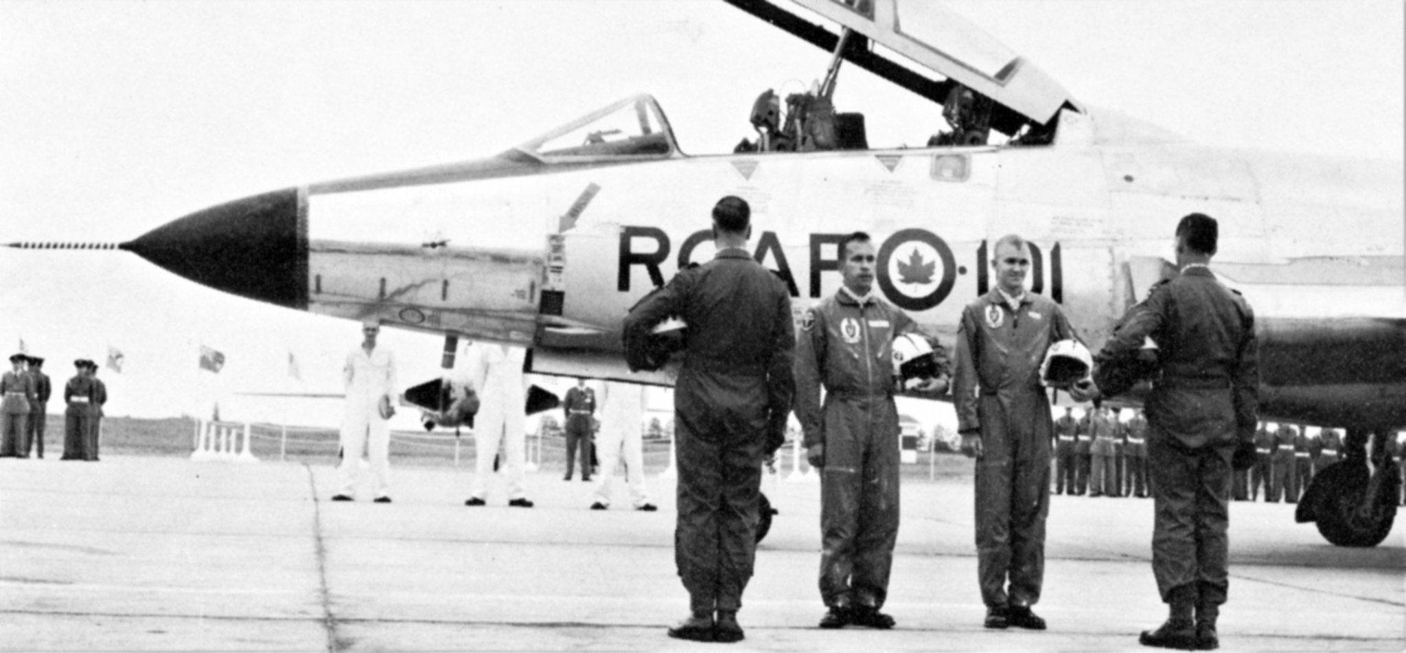 This photo was taken during the official hand-over ceremony of the first CF-101B Voodoo (Serial No. 17101), that took place at RCAF Station Uplands, Ontario in July 1961. From L-R facing the Voodoo are Flight Lieutenant W. Dobbin and Flight Lieutenant M. V. Cromie who accepted the aircraft on behalf of the RCAF from the USAF crew Captain R. Franklin and Lieutenant J. Buckerfield.