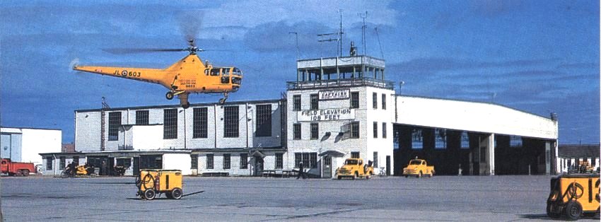 Main Hangar, No. 1(F) OTU with the base rescue Sikorsky H-5 Dragonfly (Serial No. 9603), hovering, Aug 1961.