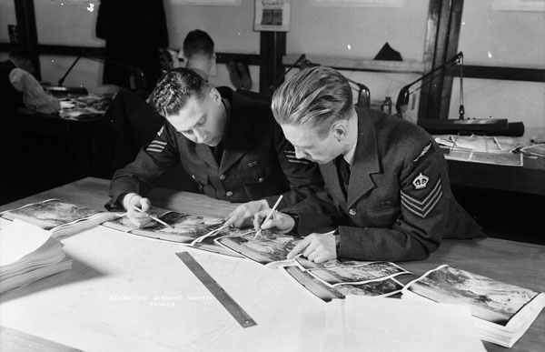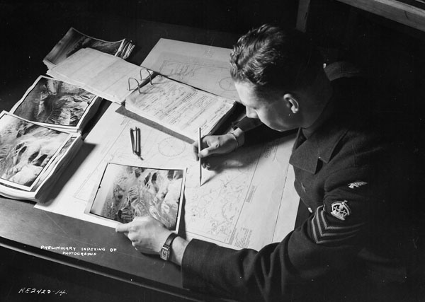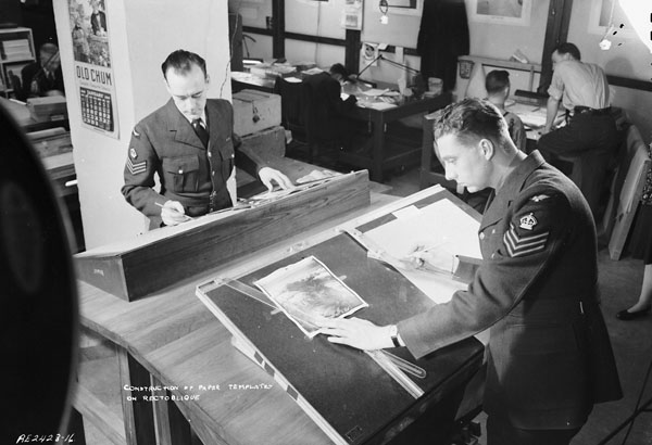 Preliminary indexing of prints for tri-metrogon mapping, No. 1 Photographic Establishment, RCAF, Rockcliffe, Ontario,1 March 1945.