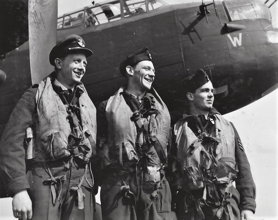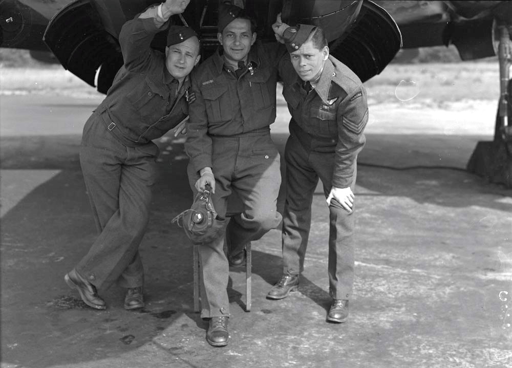 RCAF Sergeant Boucher, Air Gunner, Sergeant Laliberté, Bomb-aimer and Sergeant Paradis, Air Gunner, under a Vickers Wellington bomber, 2 May 1944.