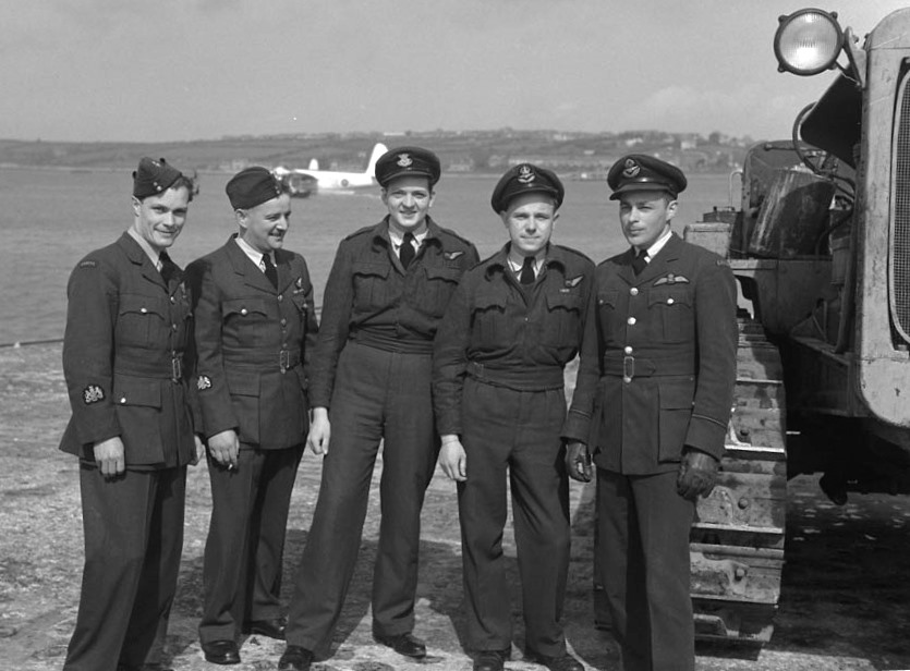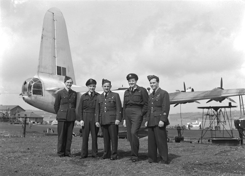 RCAF Short Sunderland aircrew, L to R: F/O Frederick Field, P/O N.C. Rowley, WO1 T.E. Campbell, F/O W.J. Bice and WO1 J.O. Fink, Coastal Command, after their machine-gun attack on a German U-boat which had been attempting to harass Allied shipping.