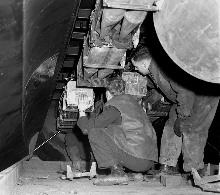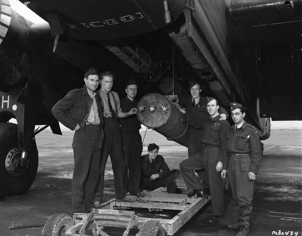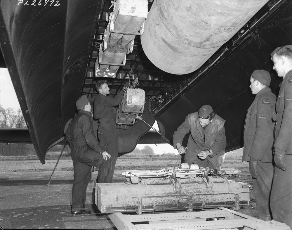 Canadian ground-crew bomb-up an RCAF heavy bomber in England, 1944.