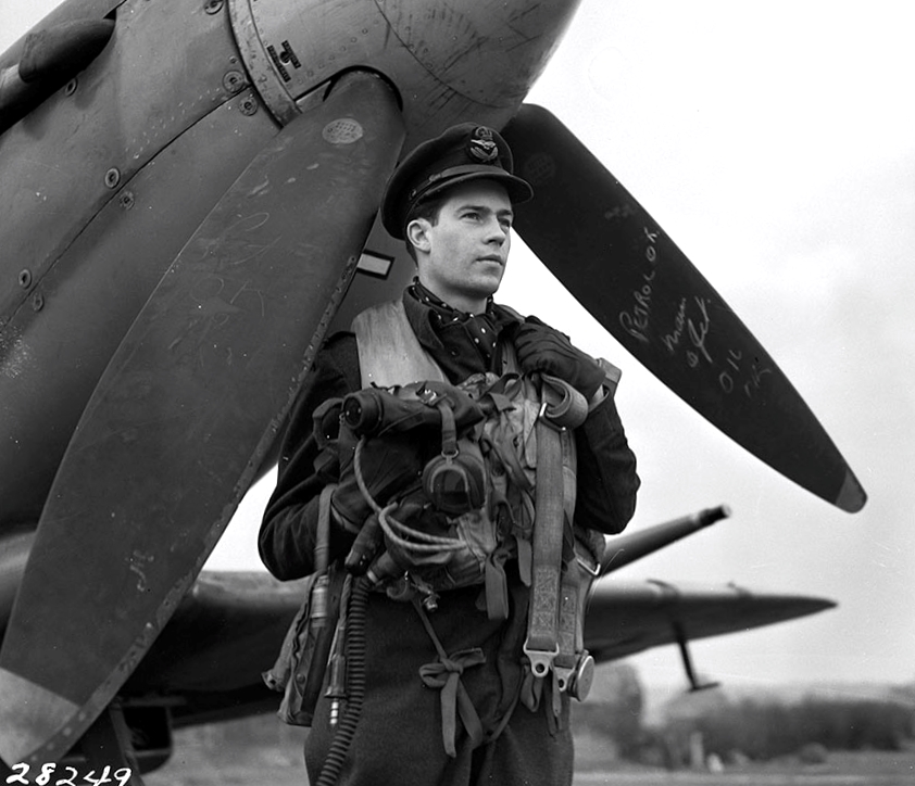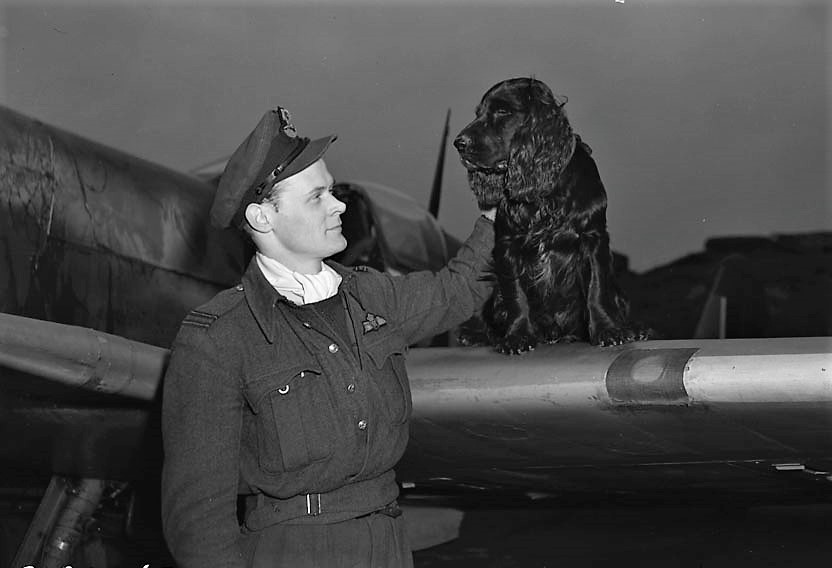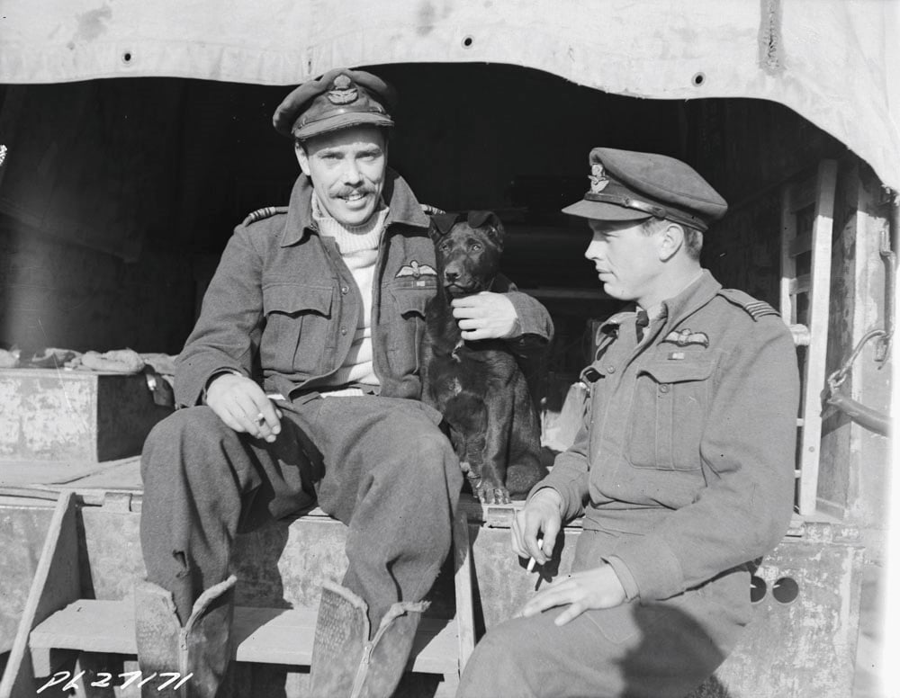 F/L Jack E. Sheppard, Section Leader in the first Canadian fighter squadron formed in England, is shown with his Spitfire and “Dinghy” the Squadron mascot. F/L Sheppard had been overseas since August 1941, and at the time of the photo, had destroyed three Focke-Wulf Fw 190s, 3 April 1944.