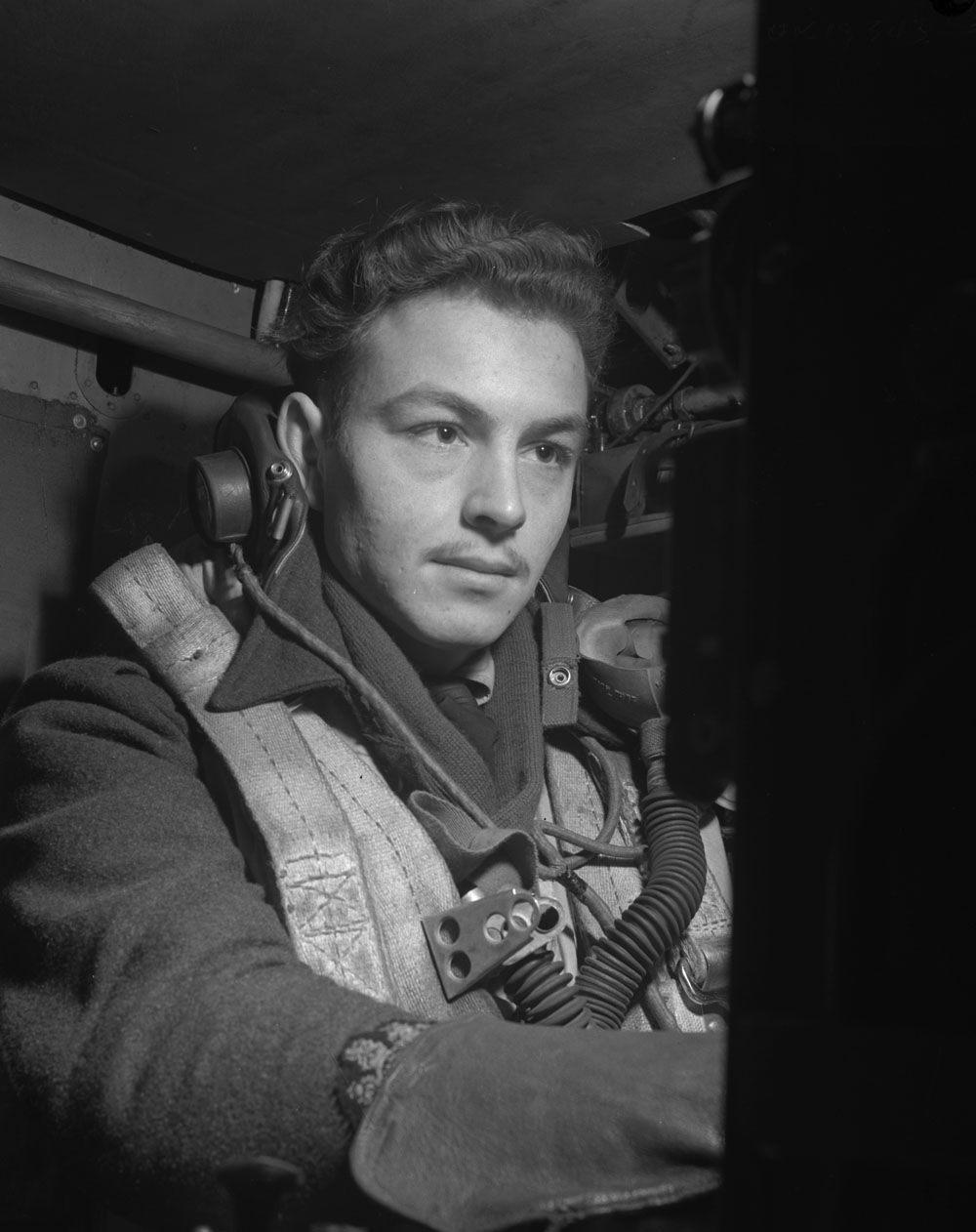 WO 1 René Briand, an RCAF wireless air gunner (WAG). During his first tour of operations with the Alouette bomber squadron he flew on missions all over the Nazi territories of occupied Europe. This photo was taken inside his aircraft showing Briand sitting in front of his wireless set, 4 January 1945.