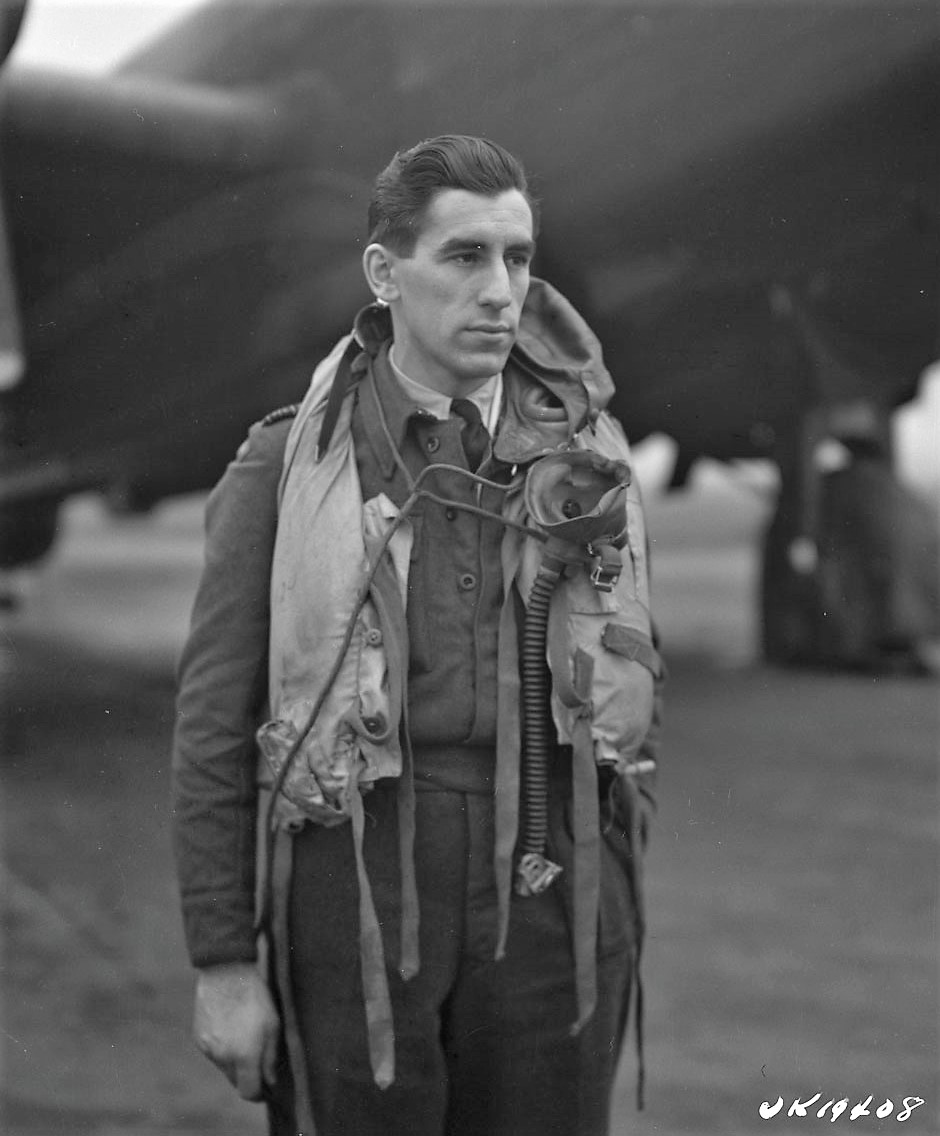 S/L Eddie St-Jean is shown here standing in front of his Handley Page Halifax bomber, shortly after he had learned of his award of the DFC. He was a flight commander with the French-Canadian “Alouette” squadron overseas, No. 425 Squadron, RCAF, 21 February 1945.