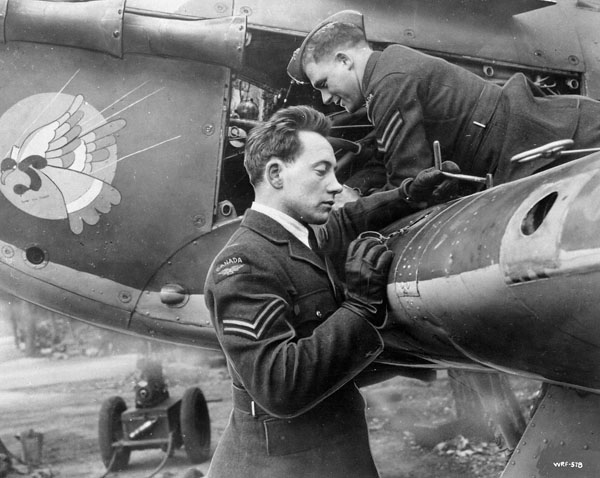 Ground-crew servicing a Hawker Hurricane IIB aircraft of No. 402 (City of Winnipeg) Squadron, Royal Canadian Air Force (RCAF), Fairwood Common, Wales, March 1942.