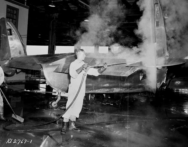 Groundcrew stripping paint from a Lockheed Lodestar aircraft, RCAF Station Rockcliffe, Ontario, 13 July 1945.