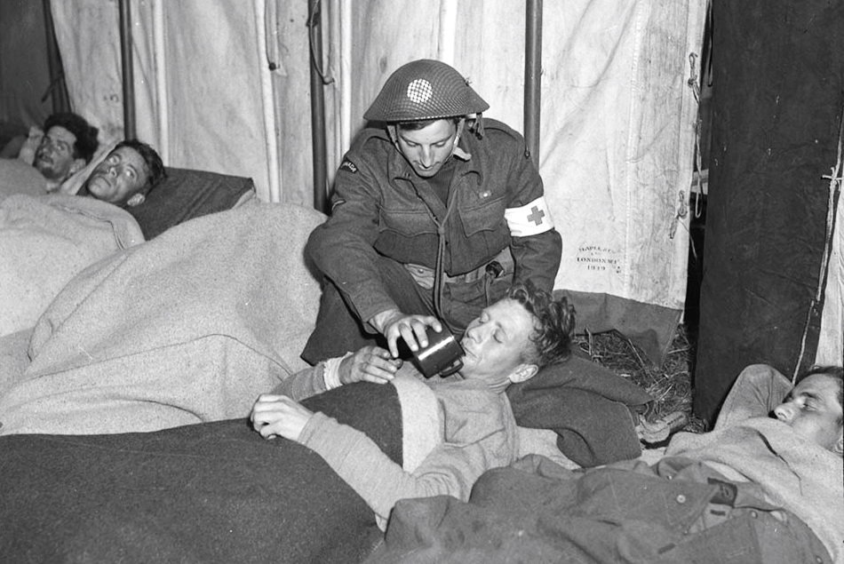 Leading Aircraftsman M.J. Merentette of the Royal Canadian Air Force giving a mug of tea to Private R. Weaver of The King’s Shropshire Light Infantry (British Army), a wounded soldier en route to England. France, 16 June 1944.
