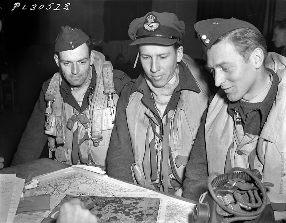 The target was Sterkrade, a strategic industrial town in the Ruhr, Germany, heavily defended with flak batteries and night-fighters. The trio from No. 431 Iroquois Squadron shown here, are telling an intelligence officer how they saw the objective pranged. Shown are (left to right) P/O Hal Phillips from Vancouver, BV, F/O Gordon Dumville from Rocanville, Saskatchewan, and F/O R. W. Harrison from Lorlie, Saskatchewan. All had completed more than ten missions with the RCAF Bomber Group, 17 June 1944.