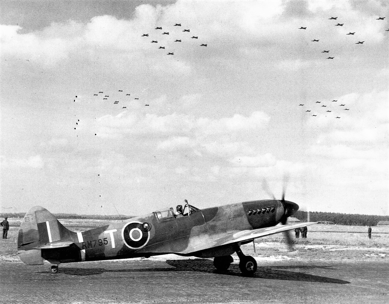 Victory Salute by aircraft of No. 84 Group, 2nd Tactical Air Force, with a Supermarine Spitfire Mk. XIV of No. 430 Squadron, RCAF at Hengelo in the Netherlands, 15 May 1945.