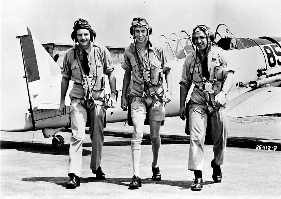 Pilots, with a North American Harvard II aircraft in the background, who took part in a Single Engine Bombing Competition at No. 31 Service Flying Training School (SFTS) (Royal Canadian Airforce Schools and Training Units), Royal Canadian Air Force, Kingston, Ontario, Canada, 13 July 1943.