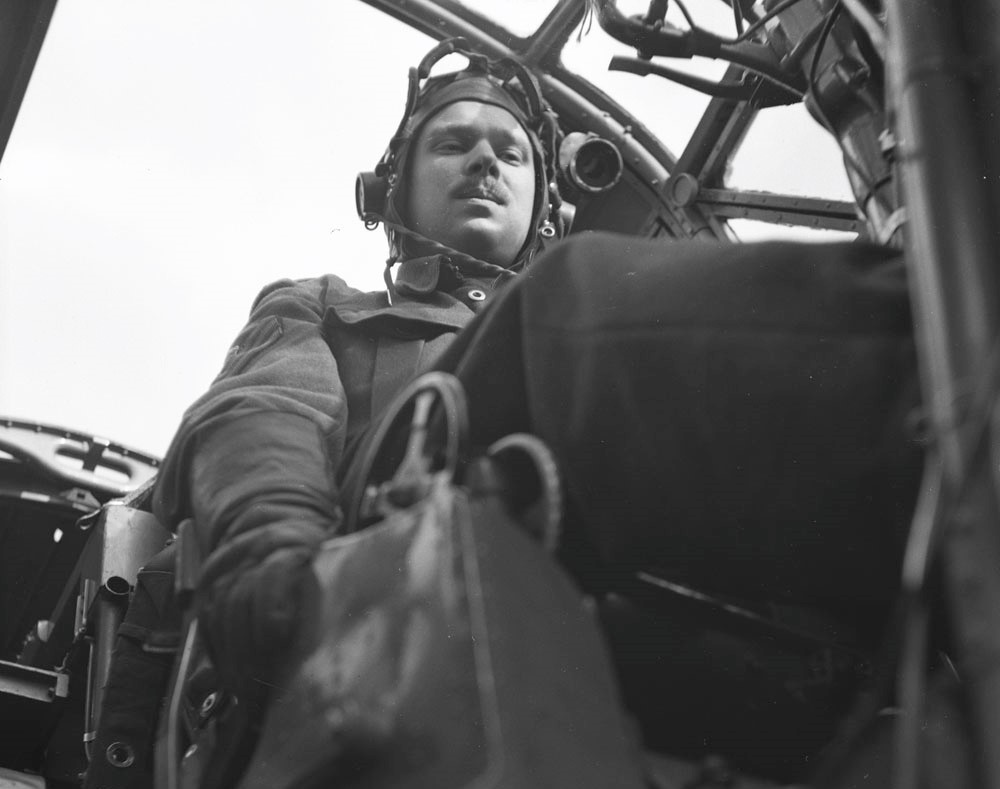 RCAF Flight Sgt. C.R. Ryerse, of Port Dover, Ontario, at the controls of a Blenheim at an Operational Training Unit [OTU] in England, 28 March 1943.