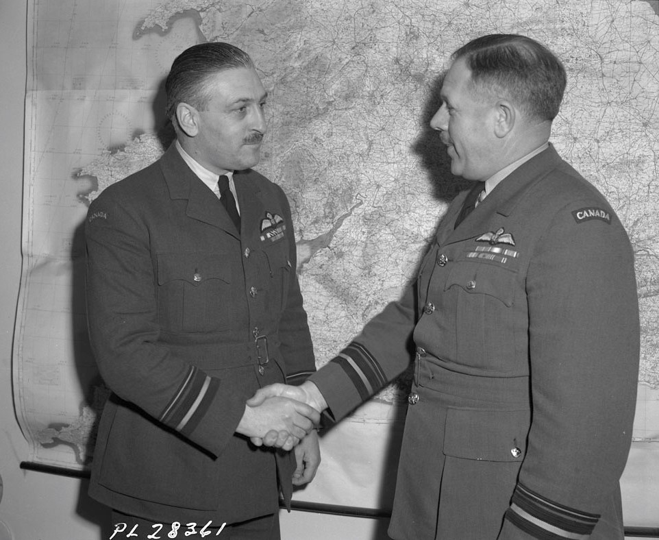 Air Vice-Marshal McEwen shaking hands with Air Vice-Marshal Brookes, 4 March 1944.