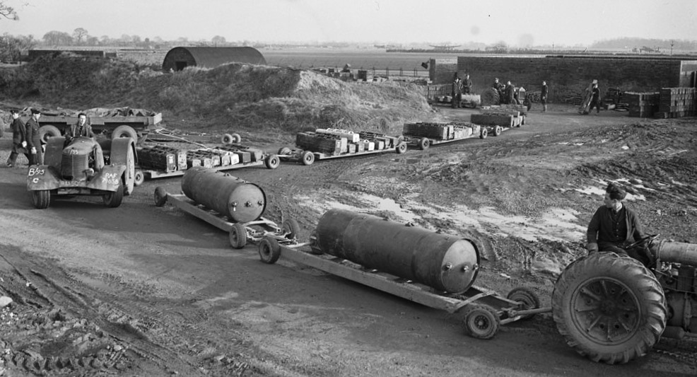 Tractor hauling high explosive to the heavy bombers of No. 6 Bomber Group RCAF Overseas, 1944.