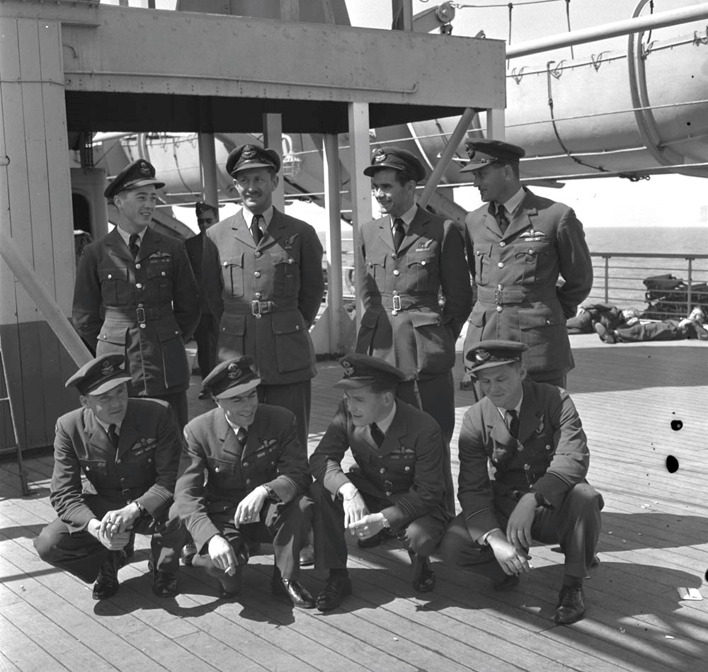 RCAF officers from Alberta aboard SS Stratheden as it docked in Quebec: Front Row, left to right, F/L D.W. Schmidt, DFC and Bar, Wetaskiwin; F/O H.E. Patch, DFM, Vegreville; F/L G.A. Berry, DFC, Lloydminster; F/O J. Perry, Lethbridge; Back Row, left to right, F/L J.M. Calder, DFC, Edmonton; F/L G.L. Scott, DFC, Innisfail; F/O G.P. Bodard, DFC, Edmonton; F/L E.S. Dunn, DFC, Calgary and formerly of Medicine Hat, 13 July 1945.