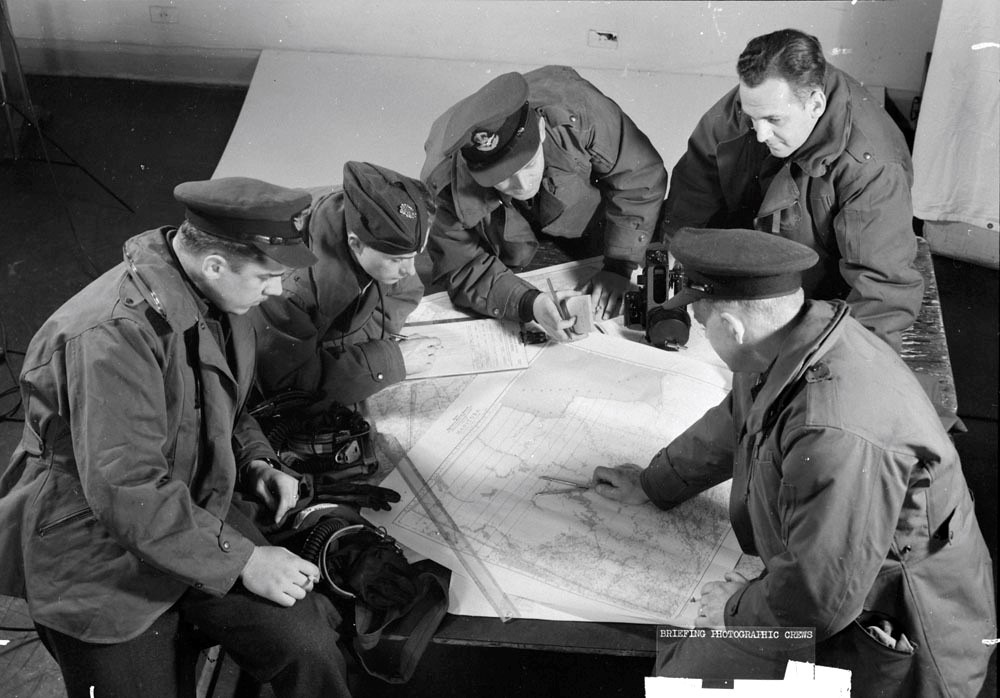 Briefing of an RCAF photographic crew prior to a tri-metrogon photographic flight, 1 March 1945.