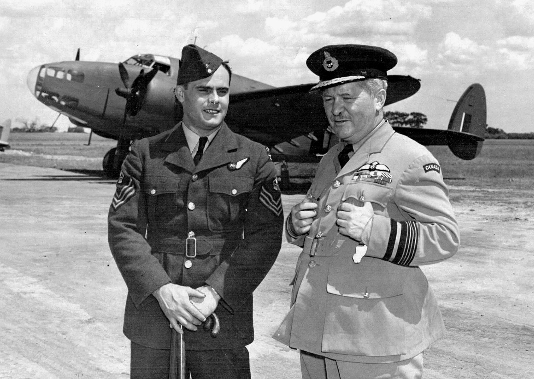 Lockheed Hudson in the background with Flight Sergeant George Calver of Grandview, Manitoba, with Air Marshal W.A. Bishop at the de Havilland Plant in Toronto in 1943. Flt Sgt Calverlost both his legs in a bombing mission over Cologne, Germany, and told thepress he wanted to fight again. He flew to Toronto from Montreal, for thefirst time since he lost his legs, to address workers at the de Havillandaircraft plant. With new artificial limbs, he was anxious to get backinto the fight.