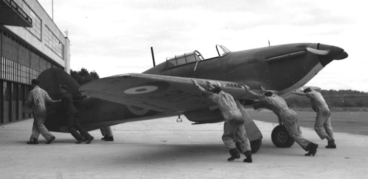 Hawker Hurricane, No. 1 (Fighter) Squadron being pushed into hanger, RCAF Station Ottawa, Ontario, 5 Sep 1939.