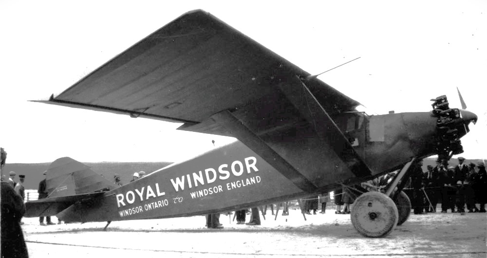 Stinson “Detroiter” aircraft “Royal Windsor” of Duke Schiller and Philwood, 7 September 1927. The Stinson Detroiter Royal Windsor, at the Old Orchard Beach airfield, in September 1927. A transatlantic flight was scheduled to be made, with the airplane, from Windsor, Ontario to Windsor, England, by aviators Duke Schiller, a Canadian, and Phil Wood, an American, in September 1927, but it was called off, while they were at Harbour Grace, Newfoundland, in Canada, after the Stinson Detroiter Sir John Carling, flown by Terence Tully and James Medcalf, and the Fokker VIIA Old Glory were lost over the Atlantic Ocean. The Sir John Carling had taken off from Harbour Grace, on September 7th and was competing for the $25,000 prize that was offered by the Carling Brewery for the first flight from London, Ontario to London, England.