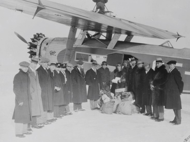 Deputy Mayor C.J. MacKenzie and other dignitaries with Fokker F. XIV aircraft CF-AIL of Western Canada Airways Ltd. which inaugurated the airmail service from Edmonton, Altberta, to Saskatoon, Saskatchewan, 3 March 1930.