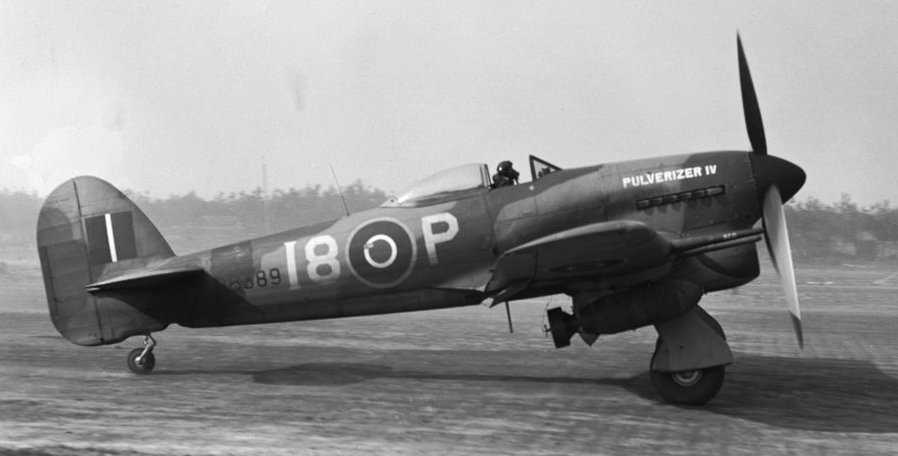 Hawker Typhoon Mk. IB, RCAF (Serial No. RB389), coded 18-P, “Pulverizer IV“, No. 440 (Fighter Bomber) Squadron RCAF, with bomb load, Goch, Germany, ca. 1944.