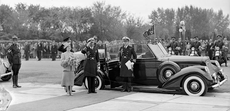 King George VI and Queen Elizabeth arrive at the Saskatchewan Provincial Legislature. Commander E.M.C. Abel-Smith, RN, Equerry to the King, on the right, 25 May 1939.