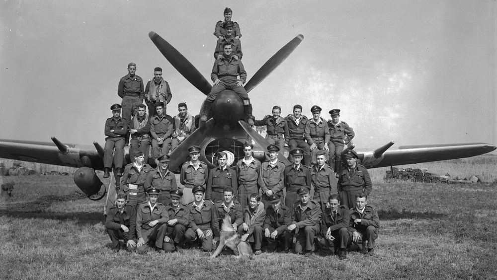 No. 440 (Fighter Bomber) Squadron members pose with a Hawker Typhoon in Normand, France, Aug 1944.