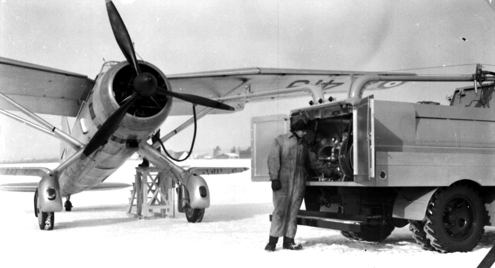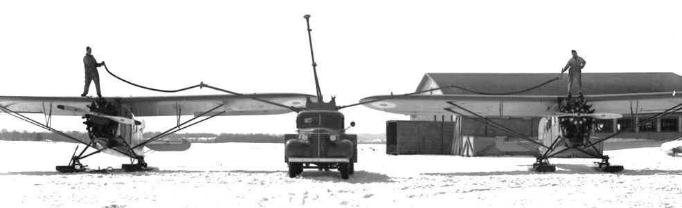 RCAF refuelling tender servicing a Westland Lysander Mk. I (Serial No. 419), No. 110 Sqn, Rockcliffe, 23 Jan 1940.