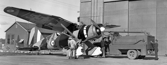 RCAF refueling tender servicing a Westland Lysander Mk. IIT (Serial No. 1557) target tug, Patricia Bay, BC, 14 Feb 1944.