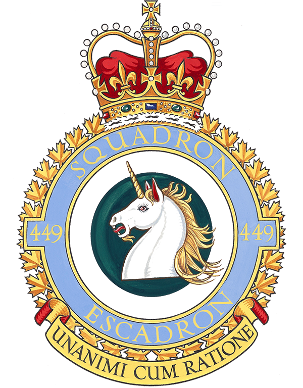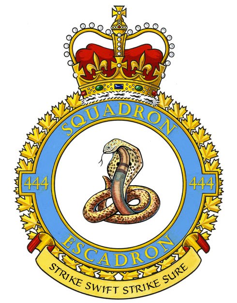 01 Mar 1953. No. 444 (Fighter) Squadron was re-formed at St. Hubert, Montreal, Quebec, equipped with Canadair CL-13 Sabre Mk. 4 and later Mk. 5 and Mk. 6 fighters. It was the last of the 12 squadrons for No. 1 Air Division Europe and joined No. 4 (Fighter) Wing at Baden-Soellingen, Germany in Sep 1953. It was deactivated on 1 Mar 1963, and reactivated on 27 May 1963 as No. 444 (Strike Attack) Squadron, one of eight RCAF squadrons chosen to fly the Canadair CF-104 Starfighter. The squadron was deactivated on 1 Apr 1967. The unit was re-formed at CFB Lahr Germany in 1972 as No. 444 Tactical Helicopter Squadron at CFB Lahr, flying the CH-112 Nomad and later the Bell CH-136 Kiowa helicopters. It served as part of Canadian Forces Europe until 1991. In 1993 it stood up again at CFB Goose Bay, Labrador as No, 444 Combat Support Squadron, flying Bell CH-135 Twin Huey helicopters until 1996. The squadron is currently equipped with three Bell CH-146 Griffon helicopters. No. 444 Combat Support Squadron’s primary mission is to provide rapid response to local emergencies during flight operations and military exercises taking place at 5 Wing. In its utility role the squadron carries out tasks such as range support and assistance to civil authorities.