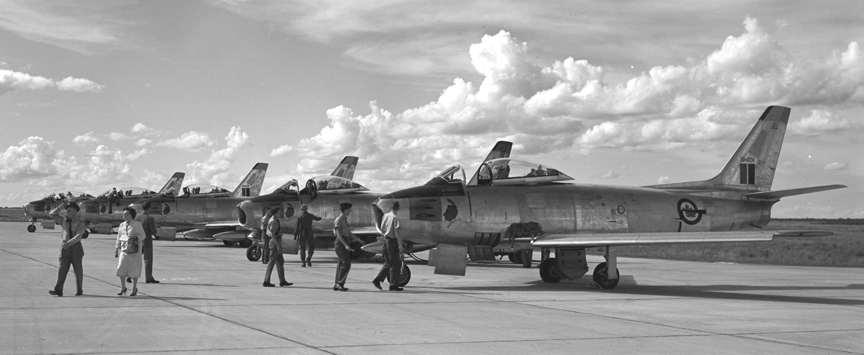 Canadair CL-13 Sabre Mk. 2 flight line, No. 431 Squadron, RCAF Station Bagotville, Quebec, 1954.