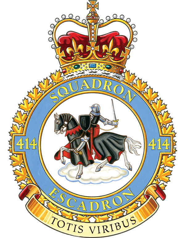 01 Nov 1952. No. 414 (Fighter) Squadron was re-formed at Bagotville, Quebec. Over its history the squadron was variously equipped with Canadair CL-13 Sabre Mk. 4, Mk. 5, Mk. 6 fighters. The squadron joined No. 4 (Fighter) Wing at Baden-Soellingen, German in Aug 1953. No. 414 (Fighter) Squadron was deactivated on 14 Jul 1957 and reactivated on 5 Aug 1957 as No. 414 All-Weather (Fighter) Squadron at North Bay, Ontario. The squadron flew Avro CF-100 Canuck and McDonnell CF-101B Voodoo fighters on North American air defence until it was disbanded on 30 Jun 1964. The squadron was reformed on 1 Apr 1959 as an Electronic Warfare (EW) unit at St. Hubert, Montreal, Quebec and on 15 Sep 1967 it was redesignated No. 414 (Electronic Warfare) Squadron. The unit provided Air Defence Command ground control radar personnel and airborne interceptor crews (flying the Avro CF-100 Canuck), with training and experiences in combatting radar jamming. On 1 Feb 1968 the squadron was integrated into the Canadian Armed Forces (CAF).