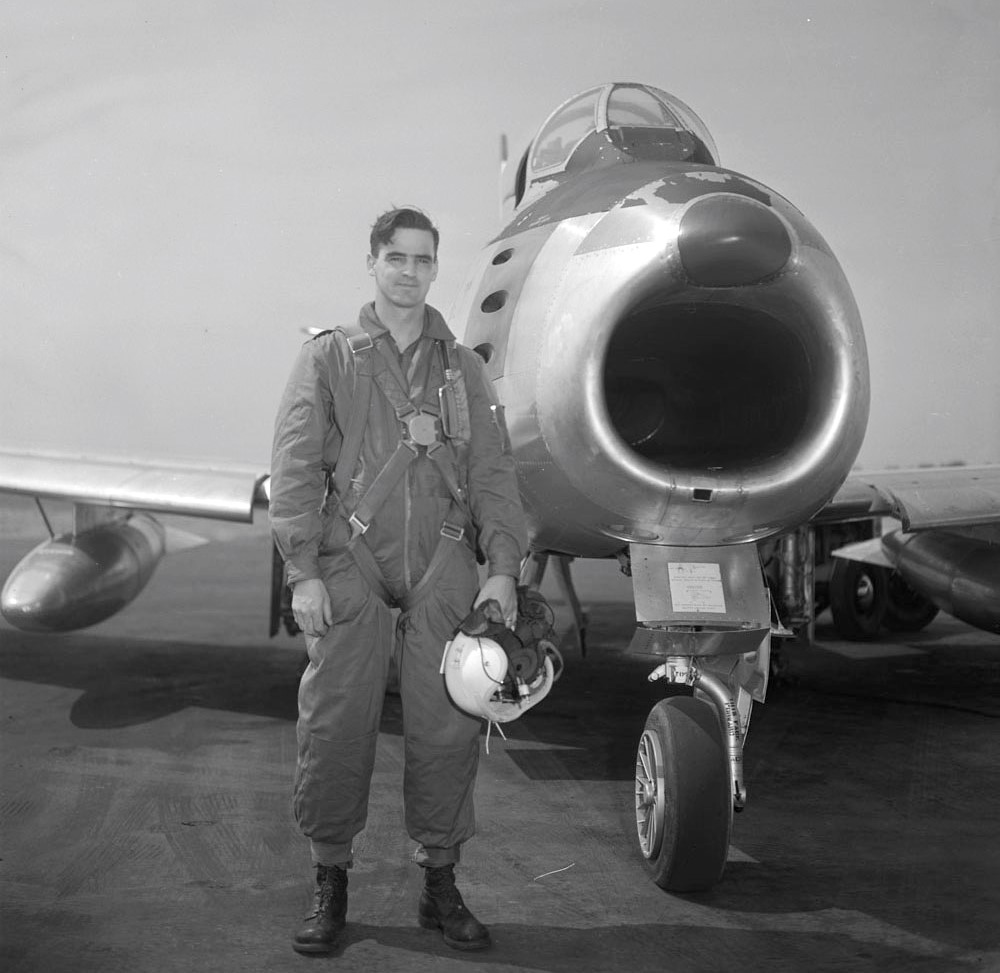 F/L Earnest A. (Ernie) Glover, RCAF (1922-1991) flew North American F-86 Sabre fighters while attached to the USAF during the Korean war. On 23 Jan 1953, while attached to the USAF in Korea, F/L E.A. Glover destroyed three MiG-15’s and damaged two others. He was the leading Royal Canadian Air Force (RCAF) scorer, and was awarded the Commonwealth Distinguished Flying Cross (DFC) in 1953. He was also awarded the American DFC.