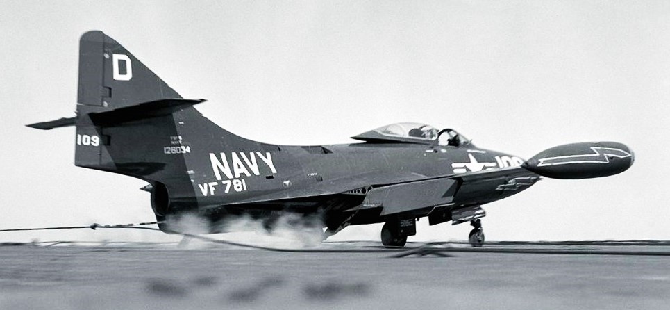 Lt. Joseph J. MacBrien, an exchange pilot from the Royal Canadian Navy lands his Grumman F9F-5 Panther (BuNo. 126034), VF 781, coded 109, aboard the aircraft carrier USS Oriskany off the coast of Korea on November 15, 1952.