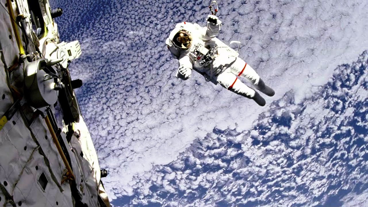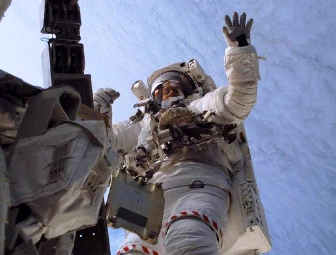 24 Apr 2001. Chris Hadfield, a former CF-188 pilot, becomes the first Canadian to perform an Extra Vehicular Activity, or spacewalk during his second space shuttle mission (STS-100) on board Endeavour. NASA astronaut Scott Parazynski is reflected in Hadfield’s visor.