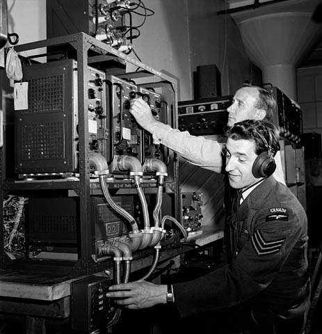 RCAF Sergeant Peter Degenstein of North Battleford, Saskatchewan (foreground) and Victor Isaac conducting final adjustments and tests on medium power transmitters prior to shipment at the RCA Victor plant, July 1944.
