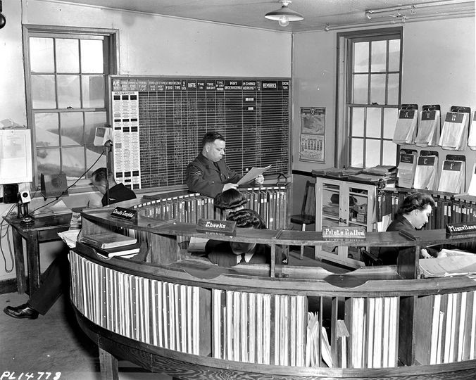 No. 2 Service Flying Training School, Uplands. At this circular desk at No. 2 Service Flying Training School, complete records of all aircraft on the station are kept. The board shows at a glance the state of serviceability and the number of planes available, 17 February 1943.
