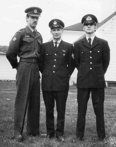 In the summer of 1971 he was posted to CFB Chatham, New Brunswick, where he completed his 20 years of service in 1974, retiring as a Warrant Officer in the Canadian Forces. At that time, my brother Dale was serving in the Canadian Navy and I was in the Militia in Halifax – this photo taken in the spring of 1973 is the only one I have of all three of us in uniform.