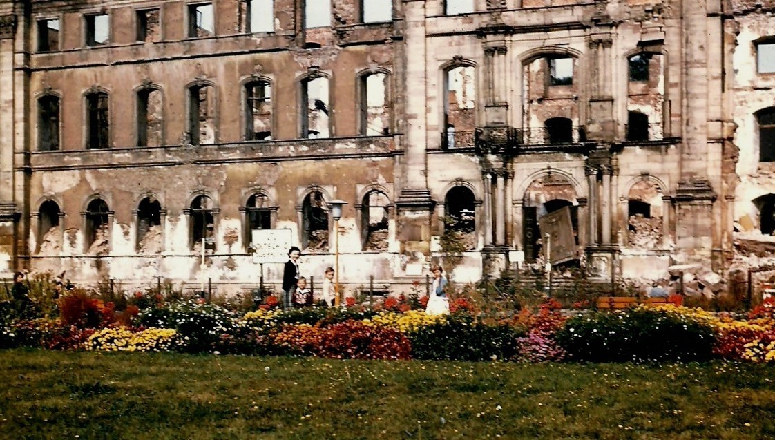 This is my Mother Beatrice, my brother Dale and I, and our first view of the badly damaged Schloss (Palace) Zweibrücken in July 1959. The palace has since been restored.