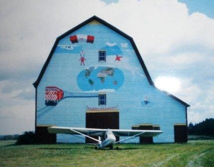 Barn with the mural and the Challenger II. The train is for Dale, the Skyhawk is for Hal, the world map is for Chris, the bicycle is for Beatrice, the skier, Viking ship symbol and aircraft is for Aage.