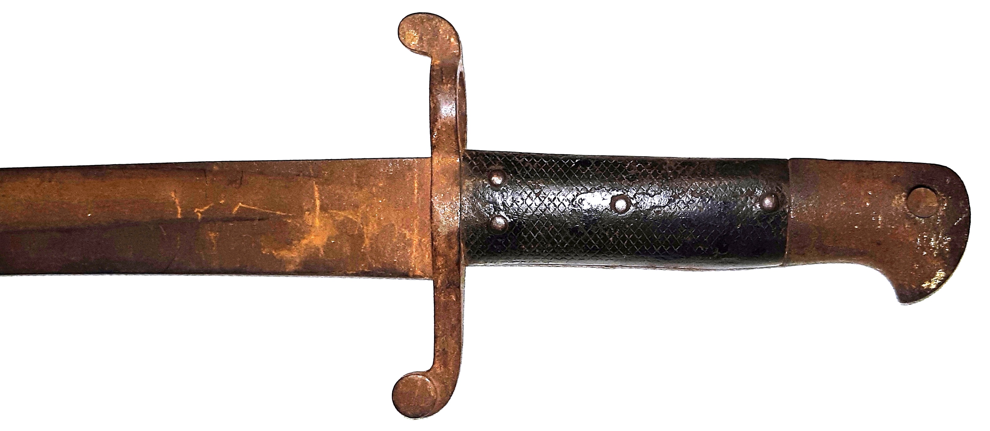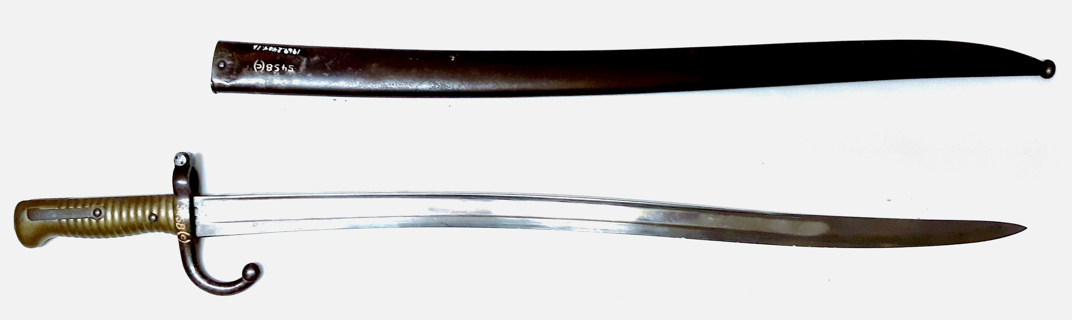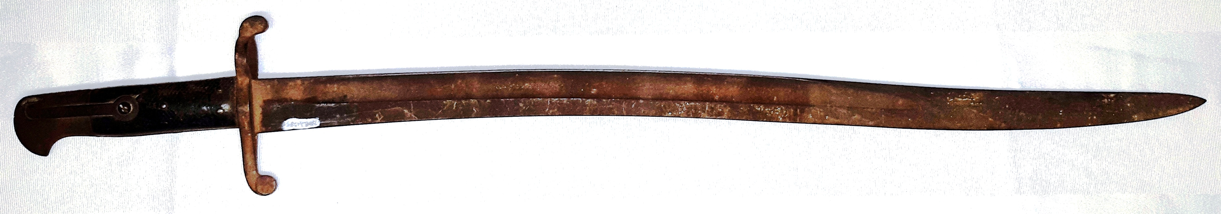 Bayonet (1969.2404.1), 5458c, designed to fit on the French Model 1866 Chassepot Rifled Infantry Musket.  It was manufactured from 1866 to about 1874.  The blade is steel, single-edged, fullered (both sides), with a re-curved or “yataghan-shape.” The blades are usually marked on the back-edge (opposite the cutting edge) with the arsenal, month, and year of manufacture; this is done in engraved cursive fashion and will appear something like, “Mre d’ Armes de Chatellerault Janvier 1866” or perhaps “Mre d’ Armes de St. Etienne 8bre [October] 1868”.