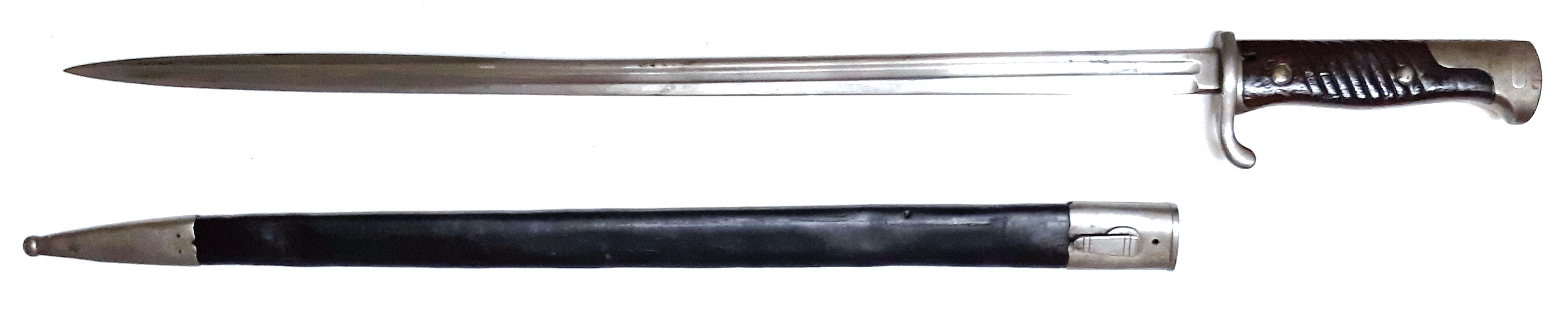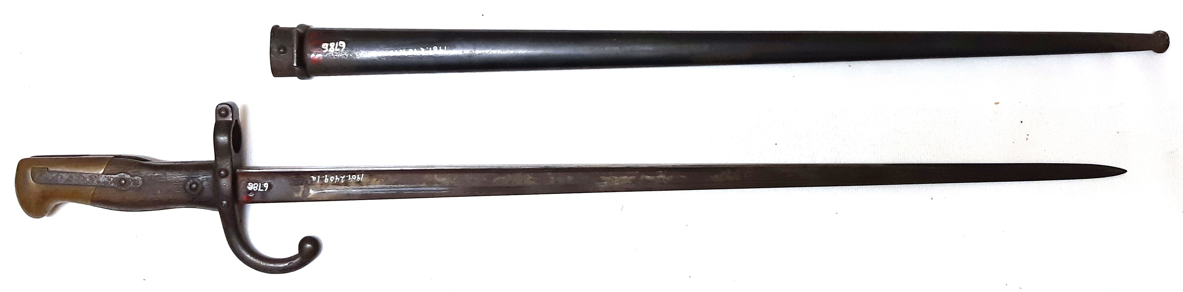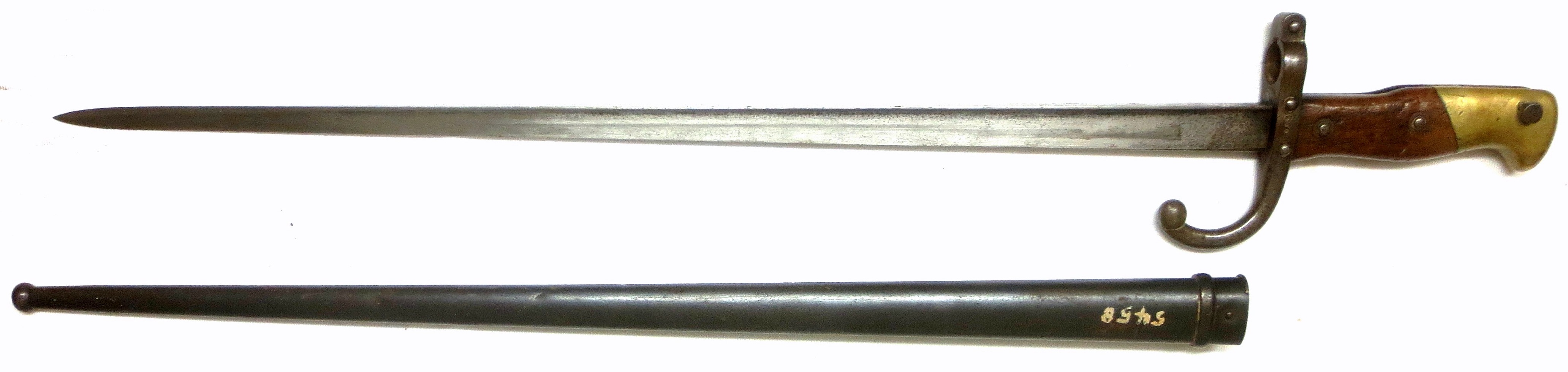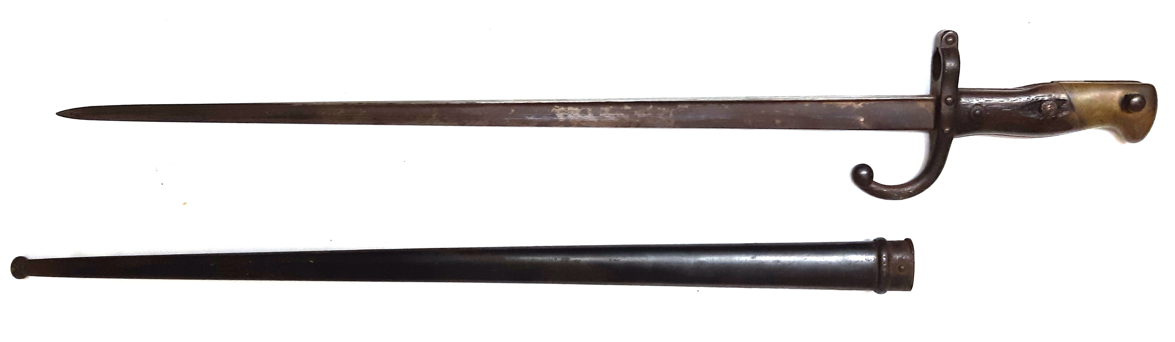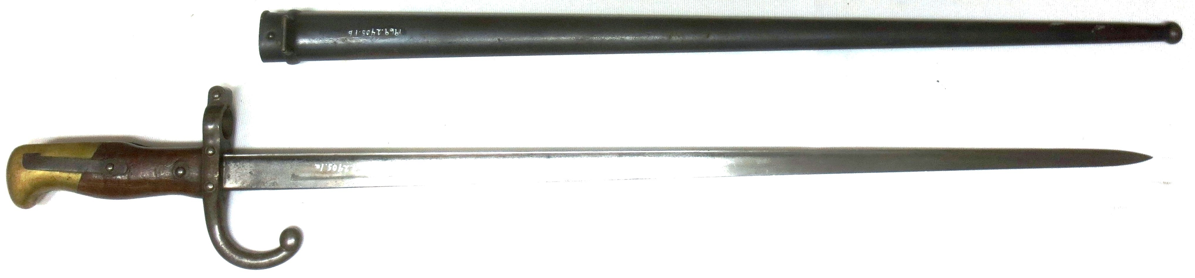 Bayonet (1969.2405.1).  1879 French Gras Bayonet with scabbard.  Engraved: Mre d’Armes de St. Etienne Mars 1879.